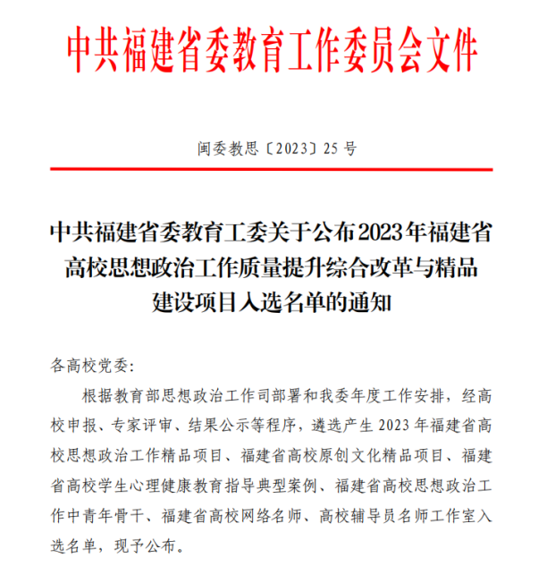 近日,中共福建省委教育工委公布了2023年福建省高校思想政治工作質(zhì)量提升綜合改革與精品建設項目入選名單,我院“‘四維度·五聯(lián)動·六開心’育人育心體系探索與實踐”、原創(chuàng)話劇《赤?!?/span>2個項目名列其中。
