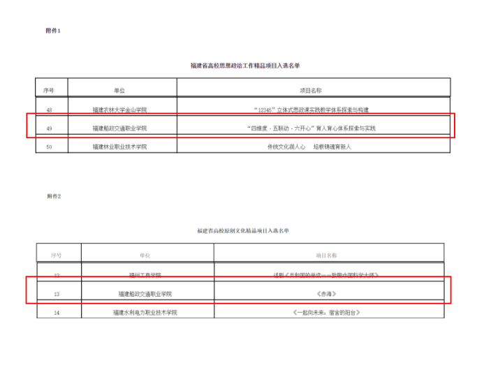 據(jù)悉,獲評高校思想政治工作精品項目的“‘四維度·五聯(lián)動·六開心’育人育心體系探索與實踐”是我院在“三全育人”背景下,圍繞“立德樹人”根本任務,不斷占領心理育人新陣地,拓展育人育心工作新局面的有力舉措和創(chuàng)新之舉;獲評高校原創(chuàng)文化精品項目的《赤海》,則彰顯了船政交通人愛國至上、敢為人先、自強不息的奮斗精神,是我院堅持以文化人、以文育人的縮影。