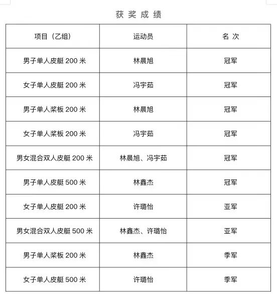 學(xué)院水上運(yùn)動(dòng)隊(duì)首度亮相中國(guó)大學(xué)生皮劃艇錦標(biāo)賽,參加高職高專(zhuān)組(乙組)比賽,隊(duì)員們奮力拼搏,展現(xiàn)出了良好的競(jìng)技狀態(tài),最終獲得6金2銀2銅的佳績(jī)。我校代表隊(duì)代還獲得體育道德風(fēng)尚獎(jiǎng)、林杰獲得優(yōu)秀教練員稱(chēng)號(hào)、林晨旭獲得優(yōu)秀運(yùn)動(dòng)員稱(chēng)號(hào)。