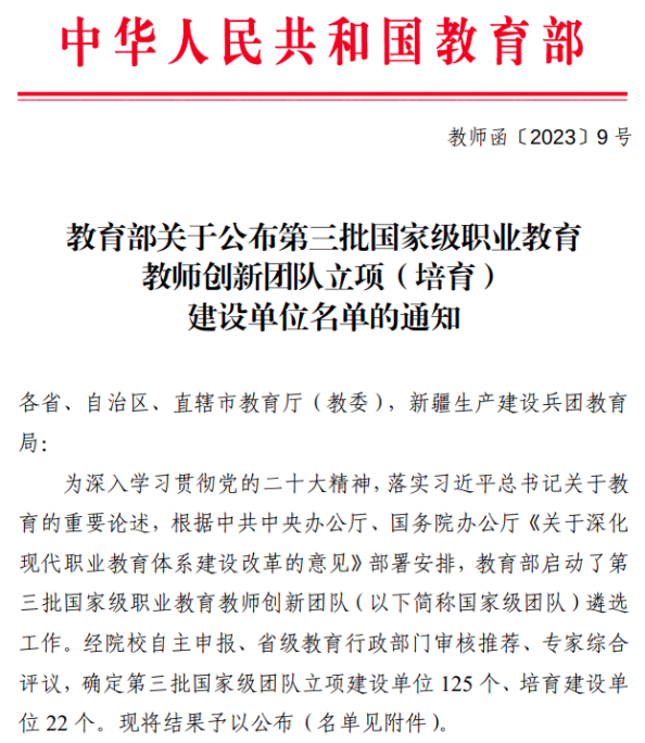近日,教育部印發(fā)《關(guān)于公布第三批國家級職業(yè)教育教師創(chuàng)新團隊立項(培育)建設(shè)單位名單的通知》,我院被確定為第三批國家級職業(yè)教育教師創(chuàng)新團隊立項(培育)建設(shè)單位。