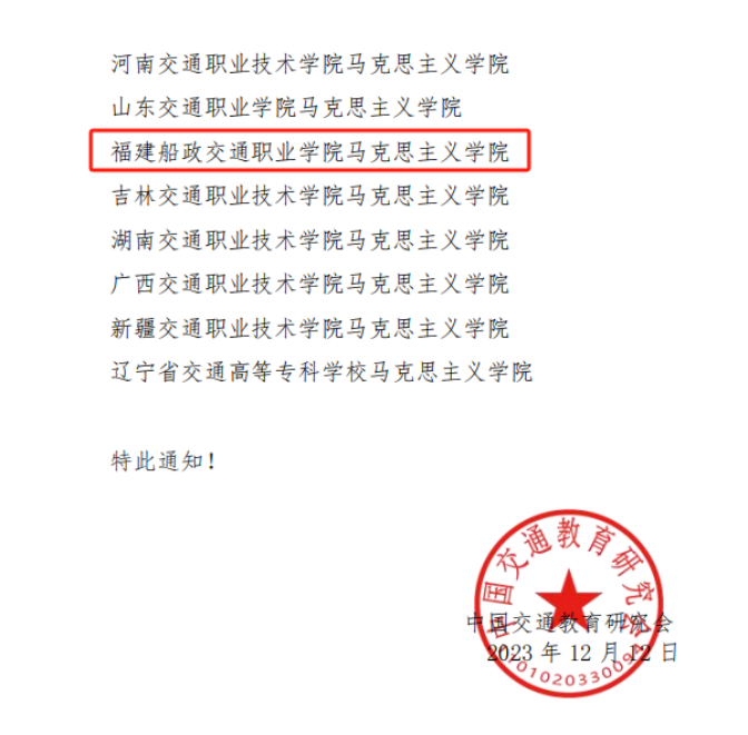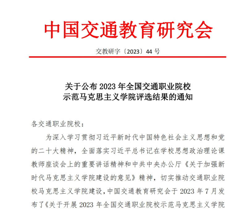 近日,我院馬克思主義學(xué)院被評(píng)為2023年全國交通職業(yè)院校示范馬克思主義學(xué)院。