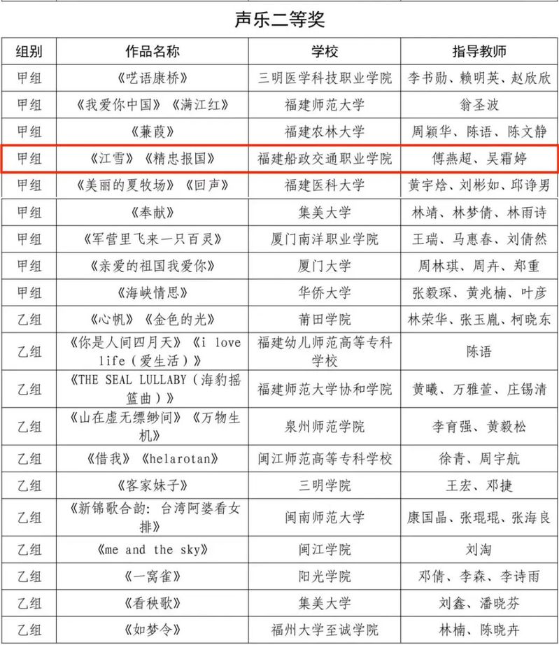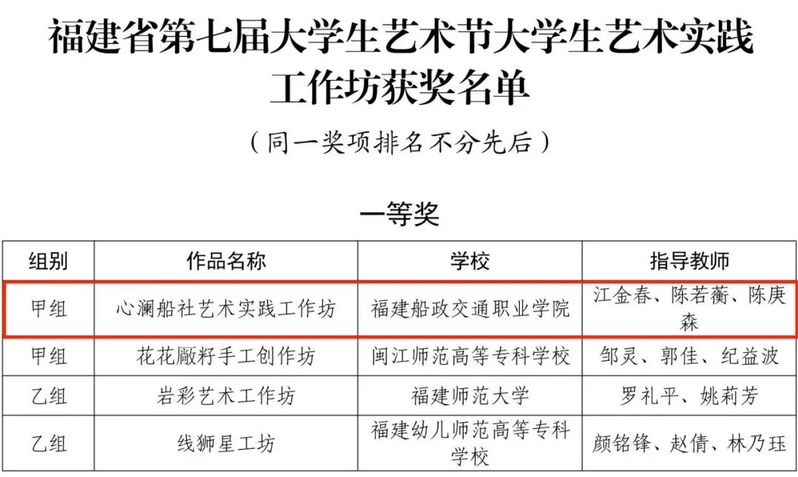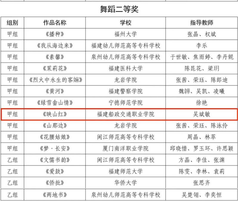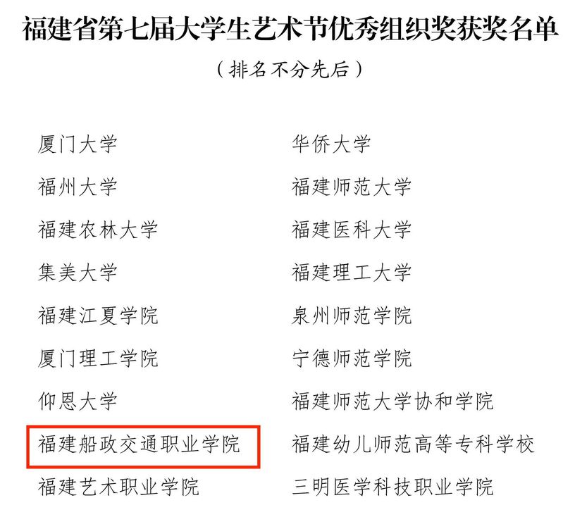 福建省第七屆大學生藝術節(jié)展演活動獲獎名單近日公布。大藝展由福建省教育廳主辦,三年舉辦一次,本屆藝術節(jié)以“厚植家國情懷,涵養(yǎng)進取品格”為主題。我院精心準備,選送了4個項目參加福建省第七屆大學生藝術節(jié)展演,斬獲6項榮譽,其中一等獎1項并入圍國賽角逐,二等獎2項,三等獎1項,學院榮獲優(yōu)秀組織獎,1位學生獲個人專項獎。