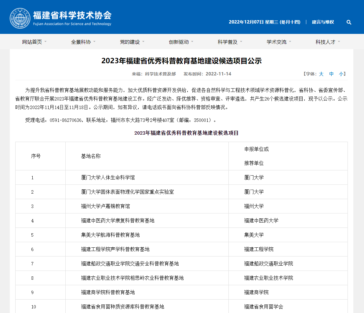 2022年8月底-9月初,在校領(lǐng)導(dǎo)的關(guān)心支持下,安全與環(huán)境學(xué)院積極籌備,完成“福建省優(yōu)秀科普教育基地”申報(bào)工作。經(jīng)福建省科學(xué)技術(shù)協(xié)會(huì)考察遴選,獲批“福建省優(yōu)秀科普教育基地”建設(shè)。
