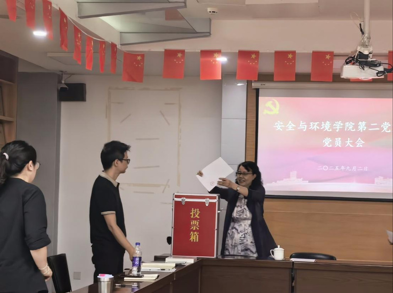 圖為黨委副書記、院長陳群以普通黨員身份參加安全與環(huán)境學(xué)院第二黨支部黨員大會(huì)并投下神圣一票
