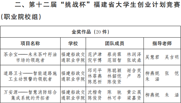由團(tuán)省委、省教育廳、省人社廳、省科協(xié)、省學(xué)聯(lián)聯(lián)合舉辦的第十二屆“挑戰(zhàn)杯”福建省大學(xué)生創(chuàng)業(yè)計(jì)劃競賽和第十一屆福建省大學(xué)生“創(chuàng)業(yè)之星”大賽落下帷幕。在創(chuàng)新創(chuàng)業(yè)學(xué)院和校團(tuán)委的共同配合下,我校共推選41個(gè)項(xiàng)目參加比賽。經(jīng)大賽組委會(huì)資格審查、大賽評審委員會(huì)復(fù)評、綜合考察、終審決賽評審等環(huán)節(jié),我院9個(gè)項(xiàng)目榮獲佳績,金獎(jiǎng)3項(xiàng)、銀獎(jiǎng)4項(xiàng)、銅獎(jiǎng)2項(xiàng),并獲“優(yōu)秀組織獎(jiǎng)”,創(chuàng)歷史最好成績。其中《茶余寶一未來茶葉籽油市場的領(lǐng)跑者》項(xiàng)目入圍國賽。
