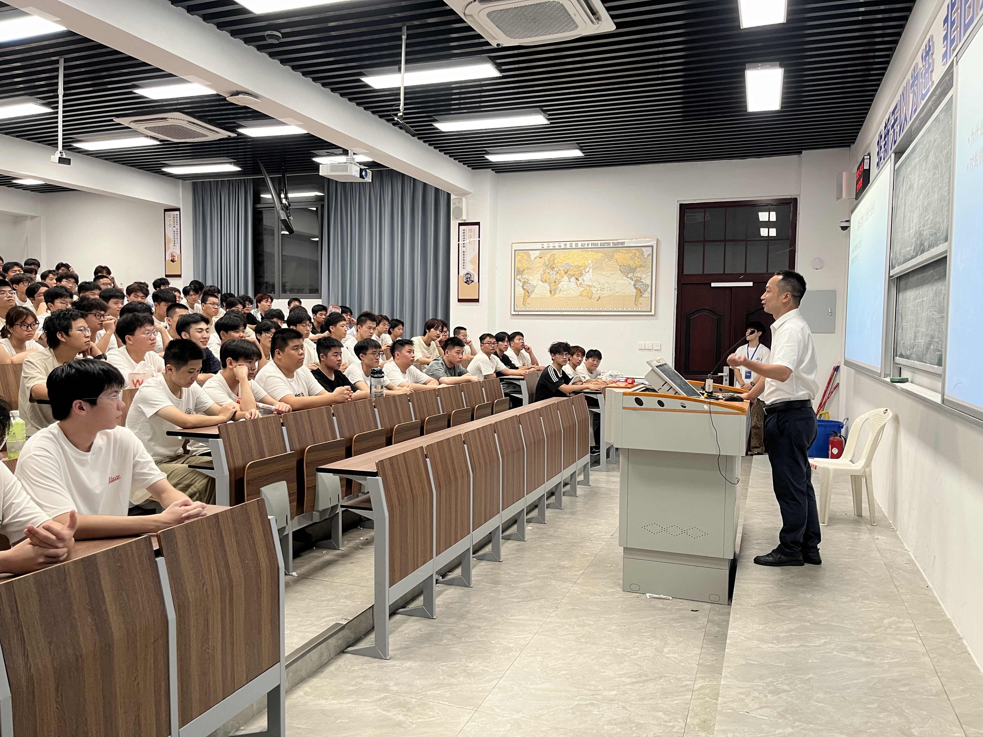 學(xué)院外聘教師福建中平船務(wù)管理公司謝文勝機務(wù)經(jīng)理和學(xué)院劉建安老師,圍繞輪機工程技術(shù)專業(yè)的發(fā)展歷程、行業(yè)前景及學(xué)校專業(yè)建設(shè)成果展開介紹,強調(diào)該專業(yè)在船舶動力系統(tǒng)運維、海洋裝備保障等領(lǐng)域的重要作用和發(fā)展前景,鼓勵新生樹立 “海洋強國” 理念,夯實專業(yè)基礎(chǔ)。以“輪機工程師的成長路徑” 為主題,詳細講解課程體系、實踐教學(xué)安排及職業(yè)資格認證要求,結(jié)合船舶機艙模擬器、學(xué)校實訓(xùn)基地等教學(xué)資源,讓新生直觀感受專業(yè)學(xué)習(xí)特色。