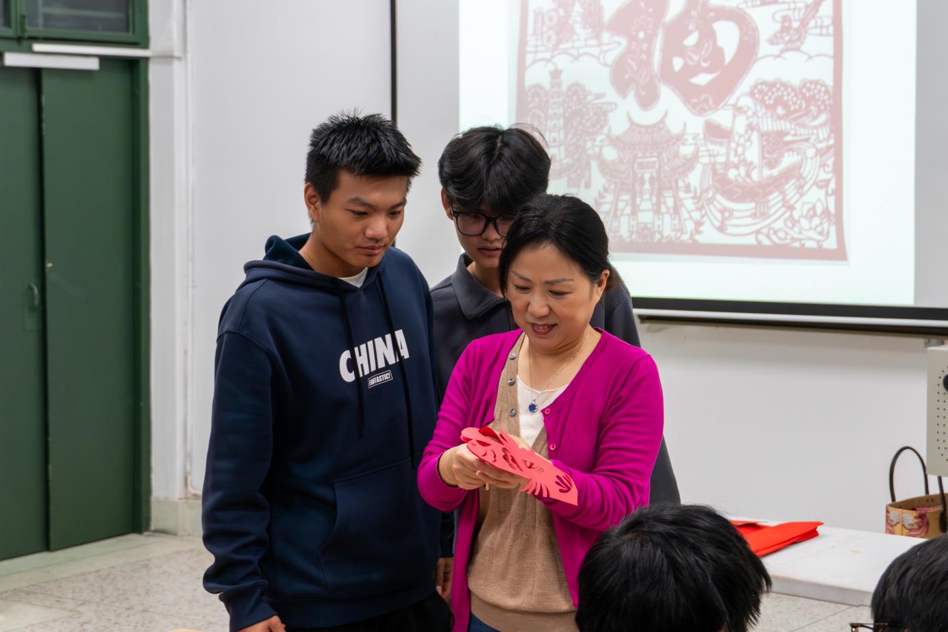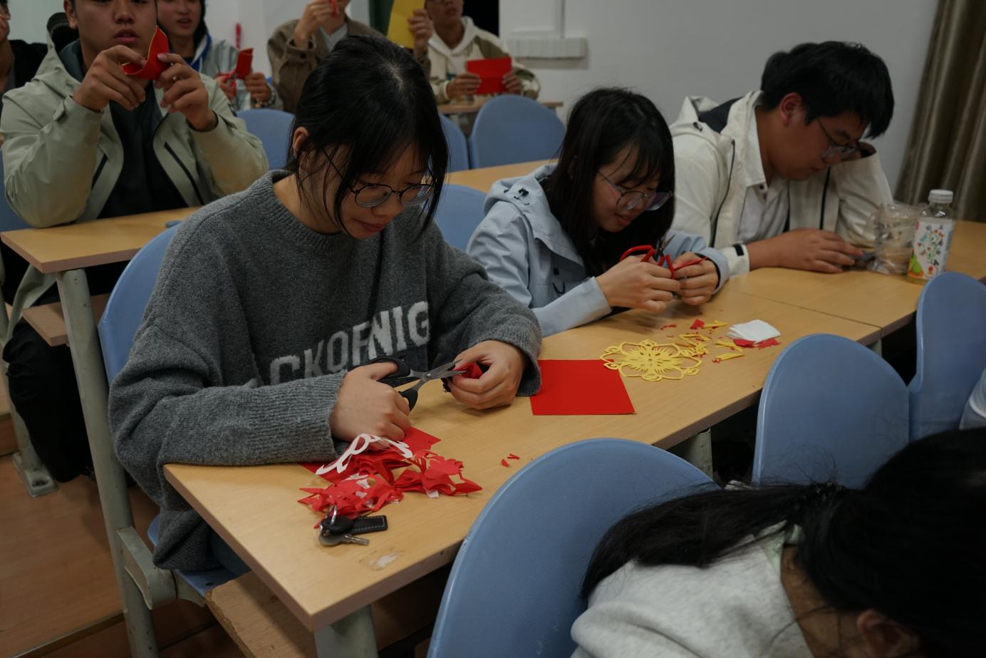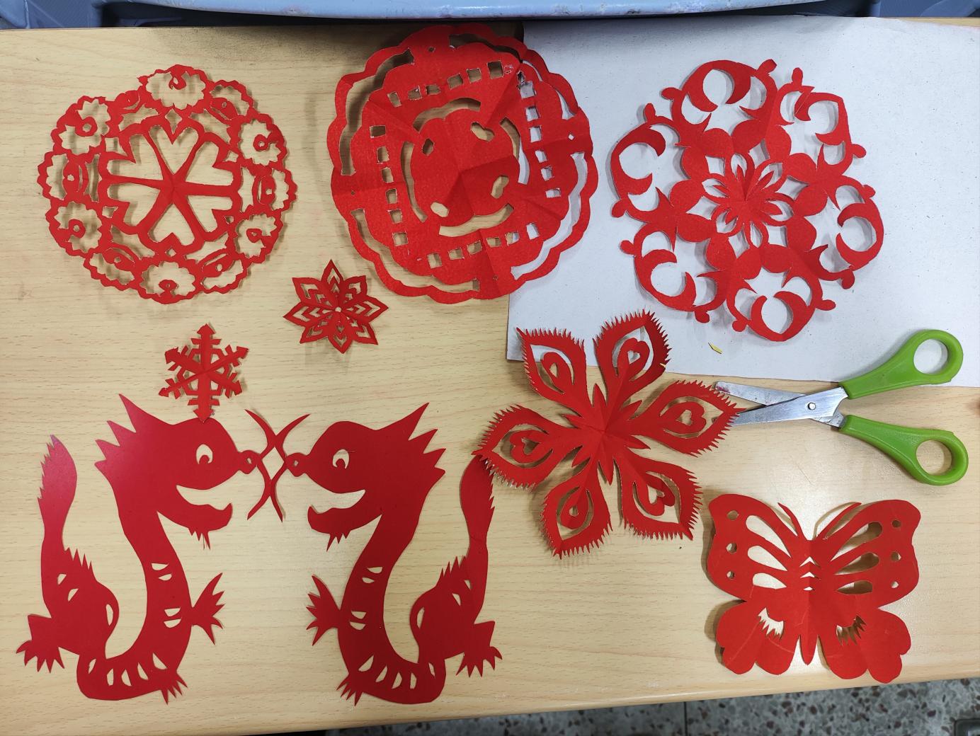 進(jìn)入實(shí)踐創(chuàng)作環(huán)節(jié),董老師親自示范指導(dǎo),耐心解答學(xué)生們的疑問。同學(xué)們熱情高漲、踴躍參與,紅紙?jiān)谥讣夥w,剪刀在紙上流轉(zhuǎn),一個(gè)個(gè)獨(dú)具巧思的圖案逐漸成型。