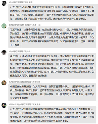 2019級(jí)城市軌道交通運(yùn)營(yíng)管理2班鄭昕:通過(guò)學(xué)習(xí)《習(xí)近平給北京大學(xué)的留學(xué)生們回信》,我了解到在北京大學(xué)的留學(xué)生們積極學(xué)習(xí)中國(guó)共產(chǎn)黨歷史和了解中國(guó)國(guó)情,我深知中國(guó)共產(chǎn)黨是為中國(guó)人民謀幸福的政黨,也是為促進(jìn)人類進(jìn)步事業(yè)而奮斗的政黨,我們的黨能很快地控制疫情,加速經(jīng)濟(jì)恢復(fù),同時(shí)積極援助其他國(guó)家抗擊疫情,體現(xiàn)了中國(guó)共產(chǎn)黨人崇高的政治追求。我們應(yīng)當(dāng)更加深入地了解真實(shí)的中國(guó),堅(jiān)持中國(guó)共產(chǎn)黨的領(lǐng)導(dǎo),做一些力所能及之事,為促進(jìn)各國(guó)人民民心相通發(fā)揮積極作用。