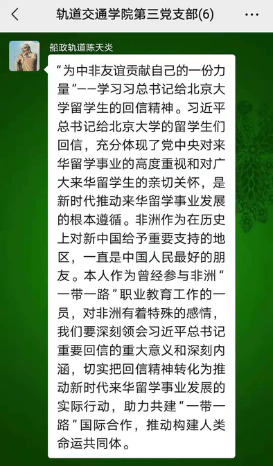軌道交通學(xué)院院長(zhǎng)陳天炎:“為中非友誼貢獻(xiàn)自己的一份力量”——學(xué)習(xí)習(xí)近平總書(shū)記給北京大學(xué)留學(xué)生的回信精神。習(xí)近平總書(shū)記給北京大學(xué)的留學(xué)生們回信,充分體現(xiàn)了黨中央對(duì)來(lái)華留學(xué)事業(yè)的高度重視和對(duì)廣大來(lái)華留學(xué)生的親切關(guān)懷,是新時(shí)代推動(dòng)來(lái)華留學(xué)事業(yè)發(fā)展的根本遵循。非洲作為在歷史上對(duì)新中國(guó)給予重要支持的地區(qū),一直是中國(guó)人民最好的朋友。本人作為曾經(jīng)參與非洲“一帶一路”職業(yè)教育工作的一員,對(duì)非洲有著特殊的感情,我們要深刻領(lǐng)會(huì)習(xí)近平總書(shū)記重要回信的重大意義和深刻內(nèi)涵,切實(shí)把回信精神轉(zhuǎn)化為推動(dòng)新時(shí)代來(lái)華留學(xué)事業(yè)發(fā)展的實(shí)際行動(dòng),助力共建“一帶一路”國(guó)際合作,推動(dòng)構(gòu)建人類命運(yùn)共同體。