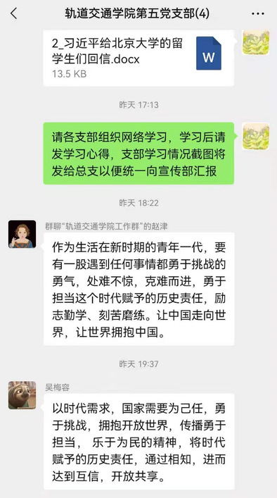 6月21日,習(xí)近平總書(shū)記給北京大學(xué)的留學(xué)生們回信,鼓勵(lì)他們更加深入地了解真實(shí)的中國(guó),把想法和體會(huì)介紹給更多的人,為促進(jìn)各國(guó)人民民心相通發(fā)揮積極作用。近日,軌道交通學(xué)院依托網(wǎng)絡(luò)平臺(tái)組織師生學(xué)習(xí)習(xí)近平總書(shū)記給北京大學(xué)的留學(xué)生們回信精神,大家倍感溫暖、倍感振奮、備受鼓舞,紛紛表示,要用所學(xué)講好中國(guó)故事,傳播好中國(guó)聲音,促進(jìn)各國(guó)人民民心相通,攜手共創(chuàng)健康美好的未來(lái)世界。