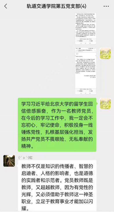 軌道交通學(xué)院青年教師陳宏意:習(xí)近平總書(shū)記的回信內(nèi)涵豐富、高瞻遠(yuǎn)矚、催人奮進(jìn)。既為高校立德樹(shù)人根本任務(wù)增添了一項(xiàng)豐富的時(shí)代內(nèi)涵,也向世界青年展現(xiàn)出中國(guó)共產(chǎn)黨的大黨風(fēng)范和使命擔(dān)當(dāng)。身為一名高校教師,應(yīng)當(dāng)立足本職工作,以立德育人為己任,引導(dǎo)青年學(xué)子聽(tīng)黨話,感恩黨,跟黨走,不忘初心、牢記使命,勇?lián)負(fù)?dān),為下一個(gè)百年目標(biāo)貢獻(xiàn)更多力量。