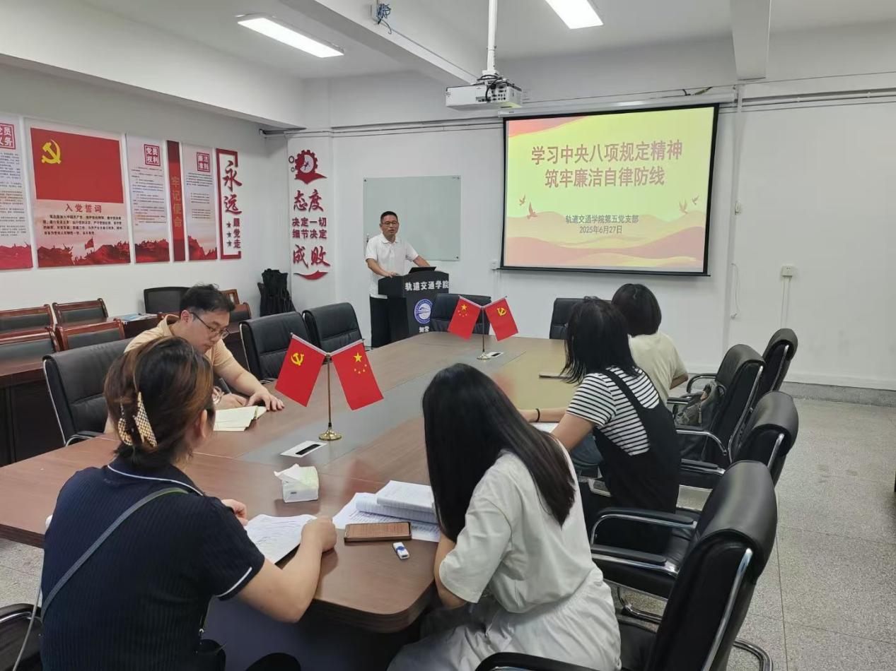 2025年6月27日,軌道交通學(xué)院第五黨支部書記陳宏意以“學(xué)習(xí)中央八項(xiàng)規(guī)定精神 筑牢廉潔自律防線”為主題,為支部教師黨員講授專題黨課。