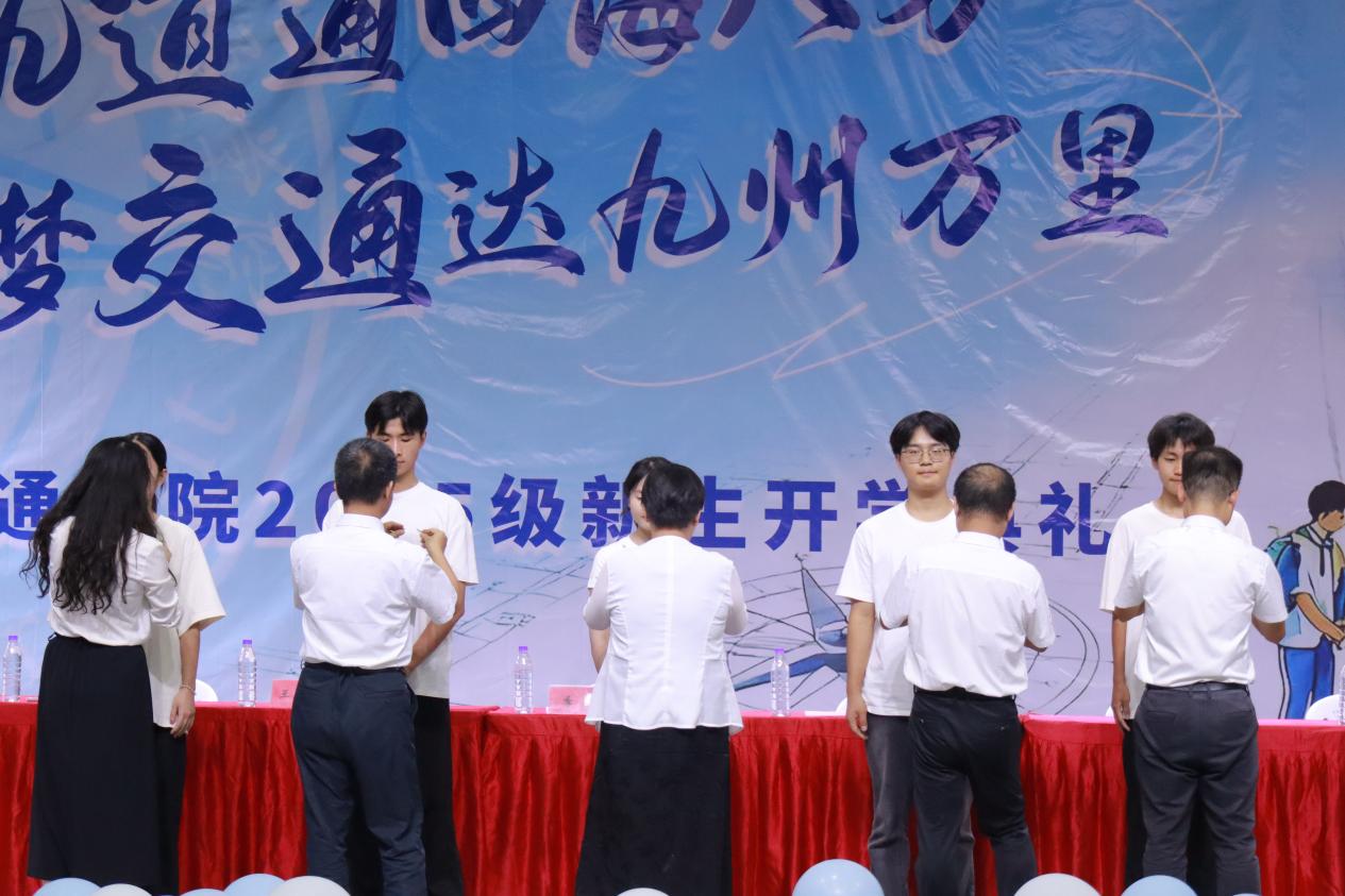 典禮現(xiàn)場最動人的環(huán)節(jié)到來。學院領導與教師代表們手持校徽,逐一為新生佩戴。當小小的校徽別在胸前,不僅是身份的象征,更承載著“傳承船政精神、深耕軌道事業(yè)”的期許。新生們輕輕撫摸徽章,眼中滿是激動與堅定——從這一刻起,他們正式以“船政人”的身份,開啟逐夢之旅。