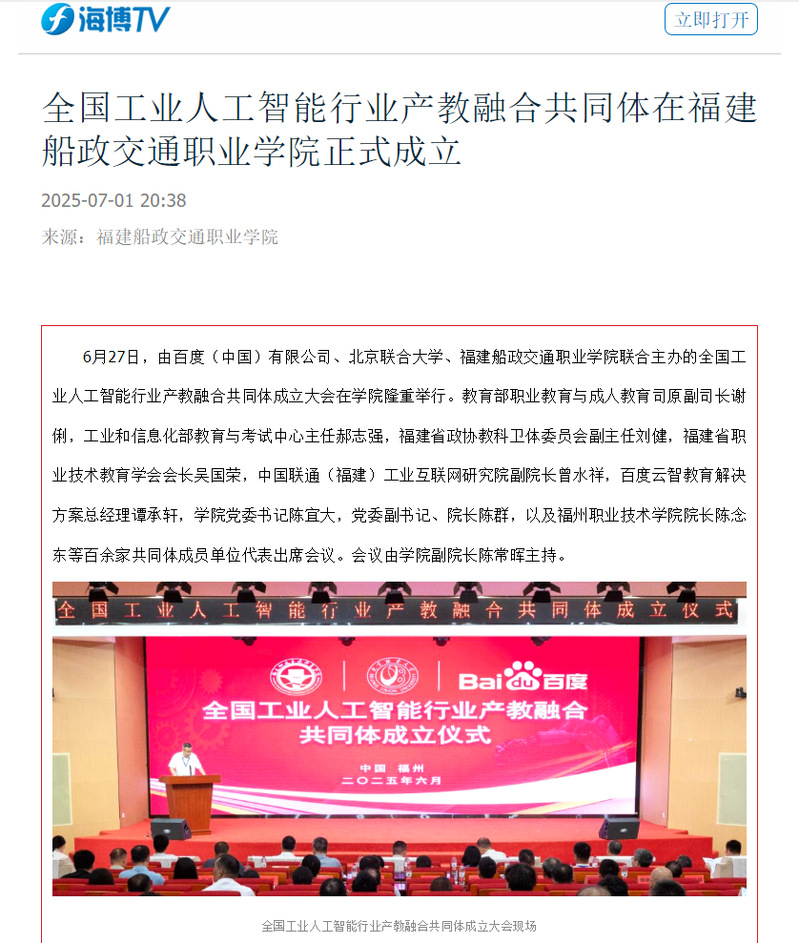 6月27日,由百度(中國)有限公司、北京聯(lián)合大學(xué)、福建船政交通職業(yè)學(xué)院聯(lián)合主辦的全國工業(yè)人工智能行業(yè)產(chǎn)教融合共同體成立大會在學(xué)院隆重舉行。海博TV等媒體平臺對此進(jìn)行宣傳報道。
