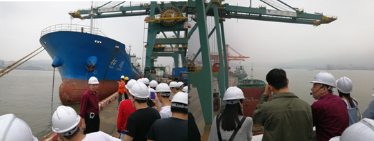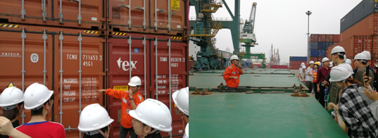 陳宏主任利用正在裝卸的集裝箱船,對同學(xué)們進(jìn)行現(xiàn)場教學(xué),講解船舶的基本知識(shí),如船舶構(gòu)造和船身標(biāo)識(shí)等,加深同學(xué)們對課堂知識(shí)的認(rèn)識(shí)和理解。在現(xiàn)場教學(xué)的過程中,陳宏主任還與同學(xué)們進(jìn)行了現(xiàn)場互動(dòng),對學(xué)生進(jìn)行提問,考查課堂學(xué)習(xí)的效果