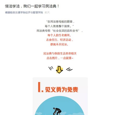 在“引”上做文章,“吹響”宣傳發(fā)動的號聲。通過微信群,微信公眾號等新媒體平臺,推送有關(guān)《民法典》解讀等內(nèi)容,以多元化方式多渠道進(jìn)行宣傳,做到讓宣傳推廣“跑起來”,讓學(xué)院師生對《民法典》有了初步的了解,引導(dǎo)師生要做學(xué)習(xí)、遵守、維護《民法典》的表率。