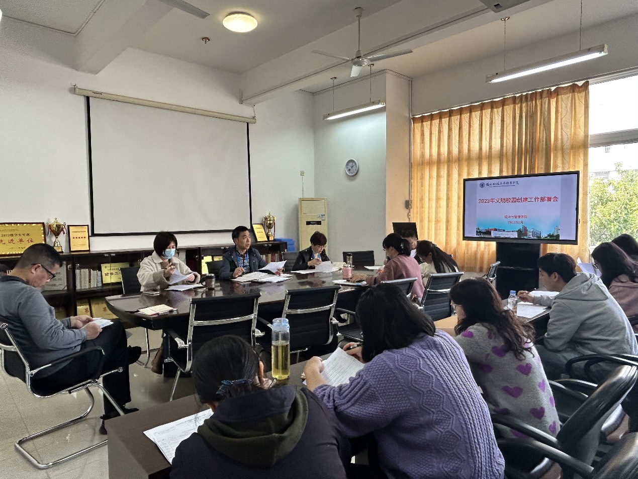 福建船政交通學(xué)院經(jīng)濟(jì)與管理學(xué)院2023年度文明校園創(chuàng)建工作部署會(huì)于3月13日召開(kāi),全面部署推進(jìn)文明校園創(chuàng)建工作。會(huì)議由俞素平書(shū)記主持,二級(jí)學(xué)院領(lǐng)導(dǎo)及各部門(mén)負(fù)責(zé)人出席會(huì)議。