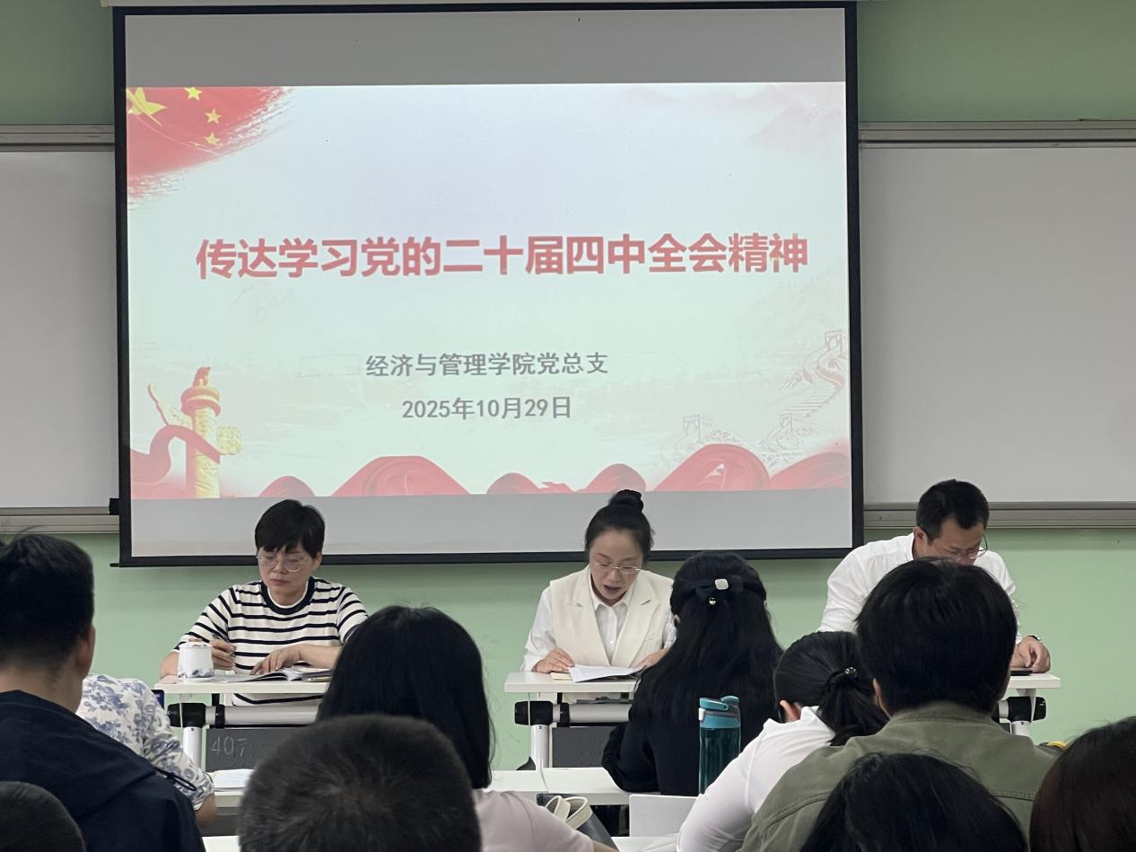 為深入學(xué)習(xí)貫徹黨的二十屆四中全會(huì)精神,切實(shí)把全院黨員干部師生的思想和行動(dòng)統(tǒng)一到全會(huì)精神上來(lái),10月29日,經(jīng)濟(jì)與管理學(xué)院召開(kāi)專題學(xué)習(xí)會(huì),黨總支書記陳慧主持會(huì)議并傳達(dá)全會(huì)核心要義,全體教師參加會(huì)議。