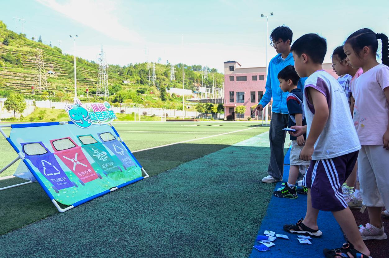 隨后,在課堂外的空地上,倡導團成員們帶領小朋友們開展 “垃圾分類投扔賽”。成員們精心制作了“可回收物”“廚余垃圾”“有害垃圾”“其他垃圾”四個模擬垃圾桶,將寫有“廢電池”“菜葉”“塑料瓶”等字樣的沙包分發(fā)給孩子們。隨著一聲“開始”,孩子們抱著沙包飛奔到對應的“垃圾桶”前投擲。這場趣味橫生的游戲,不僅讓孩子們在競技中牢記了分類標準,更在心中悄然種下了“垃圾分類,從我做起”的責任意識。