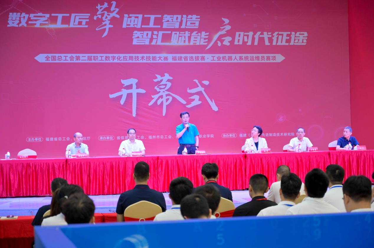 2025 年 8 月 22 日,全國總工會第二屆職工數(shù)字化應用技術技能大賽福建選拔賽-工業(yè)機器人系統(tǒng)運維員賽項在福建船政交通職業(yè)學院正式拉開帷幕。此次賽事是貫徹落實黨中央關于推進數(shù)字經(jīng)濟、數(shù)字中國建設重要要求的具體實踐,旨在提升職工數(shù)字技能,助力產(chǎn)業(yè)數(shù)字化轉(zhuǎn)型。福建省總工會黨組成員、經(jīng)費審查委員會主任、一級巡視員盧明琪,福建船政交通職業(yè)學院黨委副書記、工會主席張輝,福建省信息產(chǎn)業(yè)工會二級調(diào)研員羅有貴,福州市總工會黨組成員、四級調(diào)研員陶海華出席大賽開幕式,大賽裁判組、技術保障團隊及所有參賽選手參加開幕式。開幕式由福建船政交通職業(yè)學院副院長陳常暉主持。