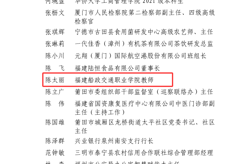 近日,共青團(tuán)福建省委公示2025年度福建青年五四獎(jiǎng)?wù)隆⒏=ㄐ聲r(shí)代青年先鋒、福建省五四紅旗團(tuán)委(團(tuán)支部)、福建省優(yōu)秀共青團(tuán)員、福建省優(yōu)秀共青團(tuán)干部表彰對(duì)象。我院教師陳太麗獲評(píng)“2025年度福建省新時(shí)代青年先鋒”榮譽(yù)稱(chēng)號(hào),特此祝賀!