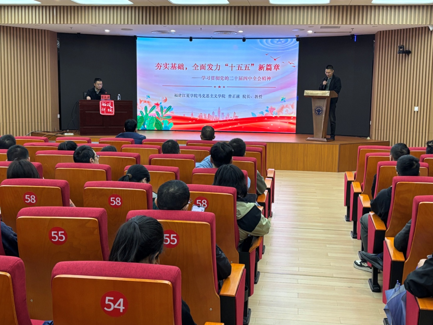 為深入學(xué)習(xí)貫徹習(xí)近平總書(shū)記在黨的二十屆四中全會(huì)上的重要講話精神和《中共中央關(guān)于制定國(guó)民經(jīng)濟(jì)和社會(huì)發(fā)展第十五個(gè)五年規(guī)劃的建議》,深刻認(rèn)識(shí)全會(huì)的重大意義, 11月12日下午,特邀福建江夏學(xué)院馬克思主義學(xué)院院長(zhǎng)曾正滋教授以夯實(shí)基礎(chǔ),全面發(fā)力“十五五”新篇章為主題的學(xué)習(xí)貫徹黨的二十屆四中全會(huì)精神專題講座。