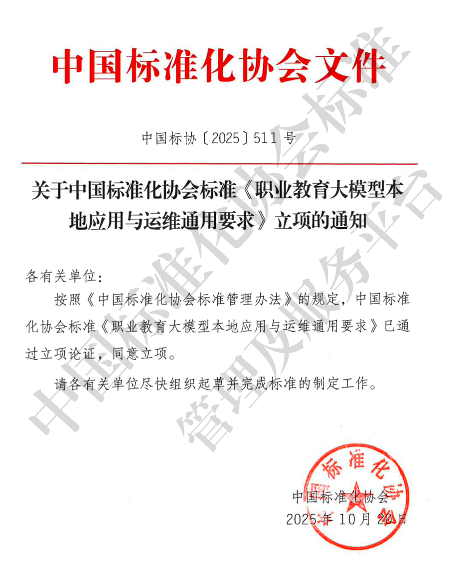 近日,由我院參與編制的團體標準《職業(yè)教育大模型本地應用與運維通用要求》已正式通過中國標準化協(xié)會立項,標志著我院在人工智能與職業(yè)教育深度融合方向的標準化工作取得重要階段性成果。