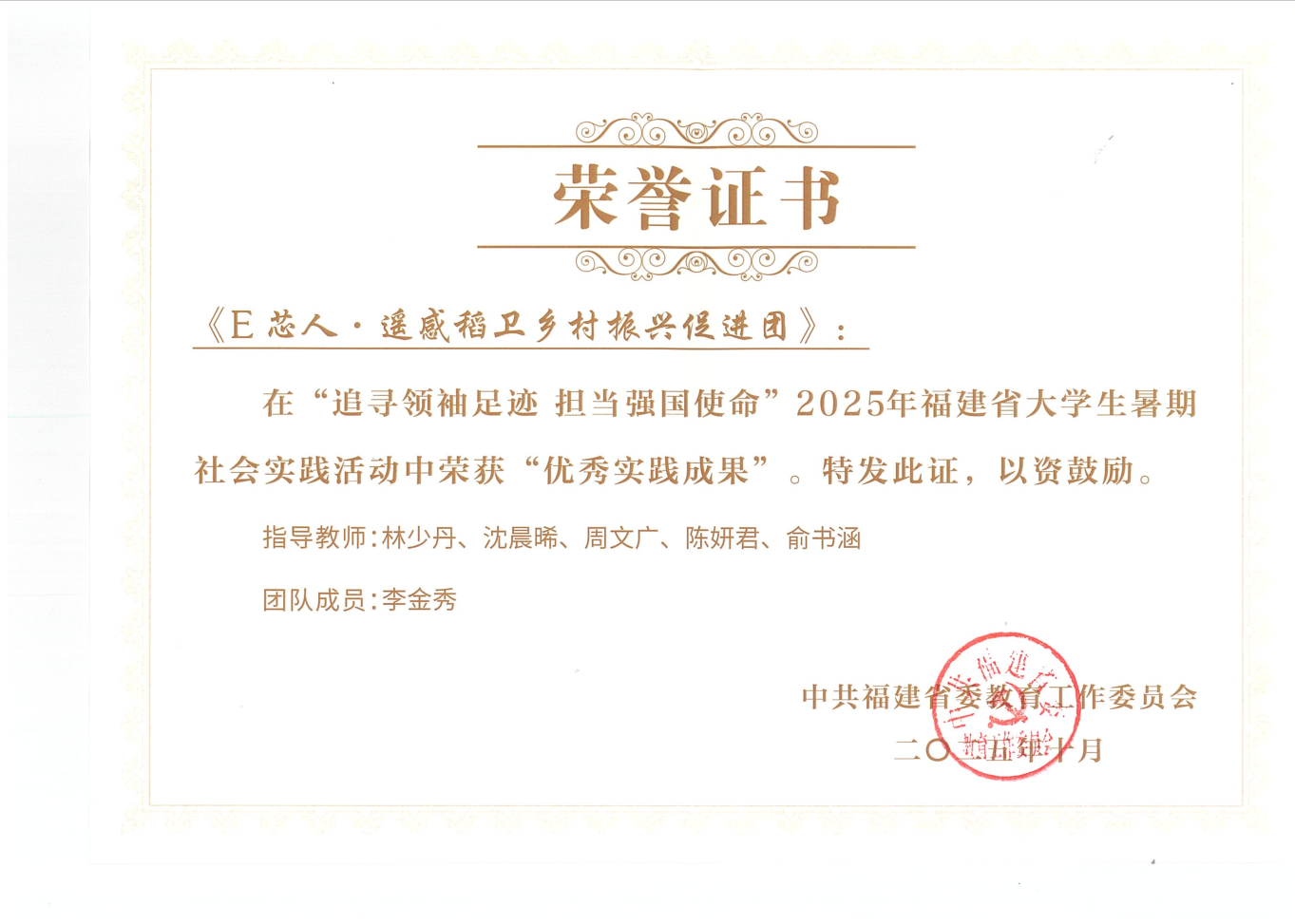 中共福建省委教育工委組織的 “追尋領(lǐng)袖足跡 擔(dān)當(dāng)強(qiáng)國(guó)使命” 2025 年福建省大學(xué)生暑期社會(huì)實(shí)踐成果遴選結(jié)果已公布?;顒?dòng)聚焦教育、科技、人才 “三位一體” 協(xié)同融合發(fā)展主題,吸引全省各高校積極參與。經(jīng)過(guò)嚴(yán)格的材料審核與專(zhuān)家評(píng)審,我院信息與智慧交通學(xué)院 “E 芯人?遙感稻衛(wèi)鄉(xiāng)村振興促進(jìn)團(tuán)” 申報(bào)的實(shí)踐成果脫穎而出,榮獲省級(jí) “優(yōu)秀實(shí)踐成果” 獎(jiǎng)!
