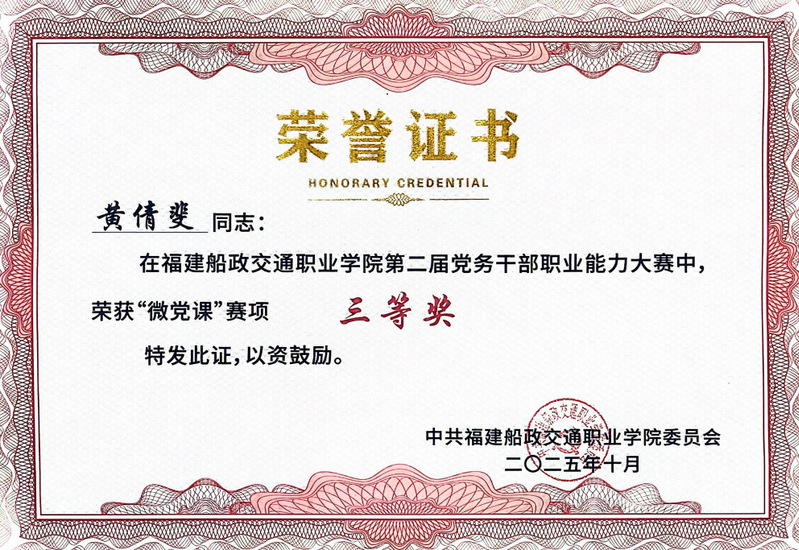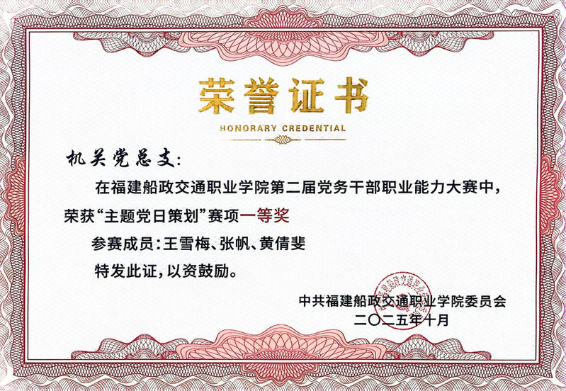 本次大賽設(shè)有黨務知識測試、主題黨日活動策劃、談心談話、微黨課四個賽項。主要考察黨員高校黨務工作知識和實操,重點考察黨務干部綜合運用理論分析、研判、解決黨務工作具體問題的能力。比賽中,機關(guān)黨總支代表隊成員分工協(xié)作、各展所長。在黨務知識測試環(huán)節(jié)沉著應答,展現(xiàn)了深厚的理論素養(yǎng);在主題黨日活動策劃環(huán)節(jié),以新穎的思路、詳實的方案和可落地的執(zhí)行路徑贏得評委一致好評,成功榮獲該賽項一等獎;談心談話環(huán)節(jié)中,隊員們精準把握溝通技巧,展現(xiàn)了自己的引導能力和解決問題能力;在微黨課環(huán)節(jié),黃倩斐同志以《從船政學堂到職教強校:一場跨越百年的“育人報國”接力》為題,結(jié)合歷史脈絡與職教實踐,以生動案例和深刻感悟傳遞初心使命,最終榮獲該賽項三等獎。