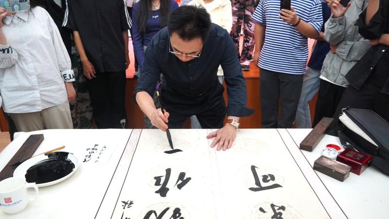 隨后,梁代教授現(xiàn)場揮毫,以一幅氣勢恢宏的墨寶贈予學院,將現(xiàn)場氛圍推向高潮。