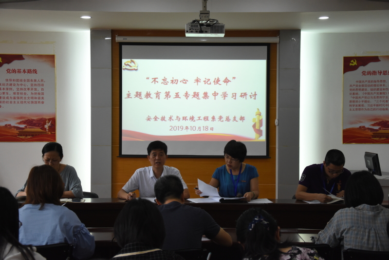 根據(jù)安全技術(shù)與環(huán)境工程系黨總支“不忘初心、牢記使命”主題教育學(xué)習(xí)研討方案安排,10月18日下午,安全技術(shù)與環(huán)境工程系召開主題教育第五專題集中學(xué)習(xí)研討會。