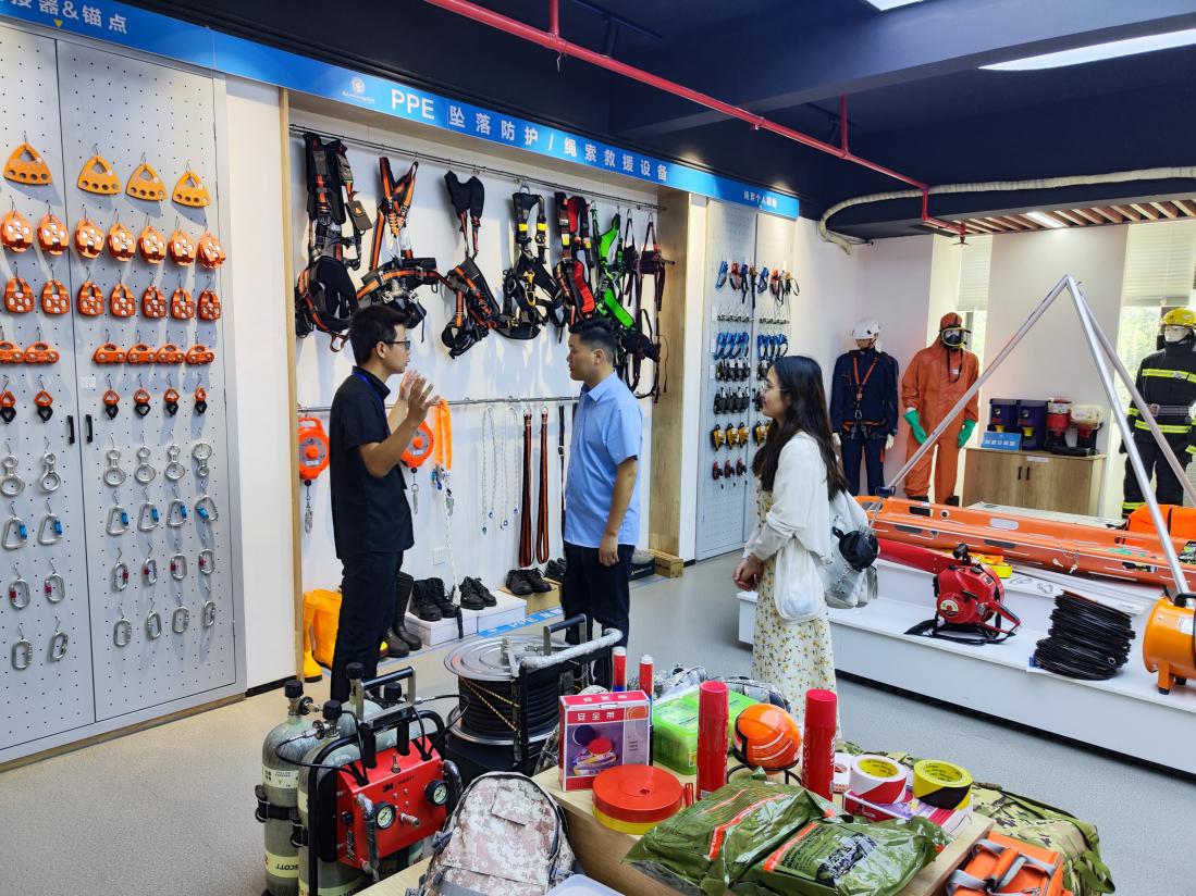 施教授一行參觀了公共安全產(chǎn)教融合實訓(xùn)基地、智慧安全工地實訓(xùn)室、應(yīng)急救援訓(xùn)練中心等教學(xué)實訓(xùn)場所。
