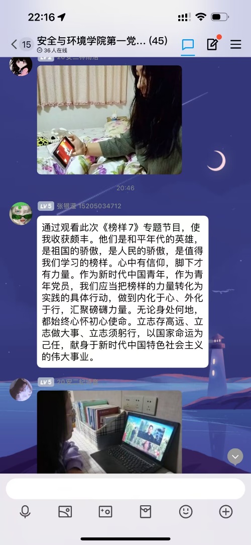 安全與環(huán)境學(xué)院第一黨支部主要以輔導(dǎo)員教師和學(xué)生為主,該支部組織教師黨員、學(xué)生黨員和入黨積極分子在創(chuàng)新樓201、202教室集中觀看,引發(fā)熱烈反響。觀看結(jié)束后,師生黨員通過線上、線下形式熱議,紛紛表達(dá)自己觀看《榜樣7》后的感想和觸動(dòng)。