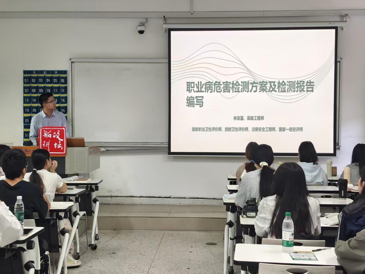 林友富高工是職業(yè)健康安全領(lǐng)域的資深專家,擁有高級(jí)工程師、國(guó)家職業(yè)衛(wèi)生評(píng)價(jià)師、放射衛(wèi)生評(píng)價(jià)師、注冊(cè)安全工程師、國(guó)家一級(jí)安評(píng)師等多項(xiàng)專業(yè)資格,長(zhǎng)期致力于職業(yè)病危害檢測(cè)與評(píng)價(jià)工作,在職業(yè)健康安全管理方面積累了豐富經(jīng)驗(yàn)。講座中,林友富以熱電廠為例,結(jié)合自身職業(yè)健康安全實(shí)踐,系統(tǒng)闡述了職業(yè)病危害因素的工程分析方法、職業(yè)病危害檢測(cè)方案的制定要點(diǎn)以及檢測(cè)報(bào)告的編寫流程,并分享了實(shí)際操作中的注意事項(xiàng)和典型案例。通過講座,學(xué)生深入了解了職業(yè)病危害檢測(cè)的專業(yè)技能和行業(yè)標(biāo)準(zhǔn),增強(qiáng)了對(duì)該領(lǐng)域的興趣與認(rèn)知。林友富高工還為學(xué)生提供了職業(yè)發(fā)展規(guī)劃建議,鼓勵(lì)有志學(xué)生投身職業(yè)健康安全事業(yè),為行業(yè)高質(zhì)量發(fā)展貢獻(xiàn)力量。