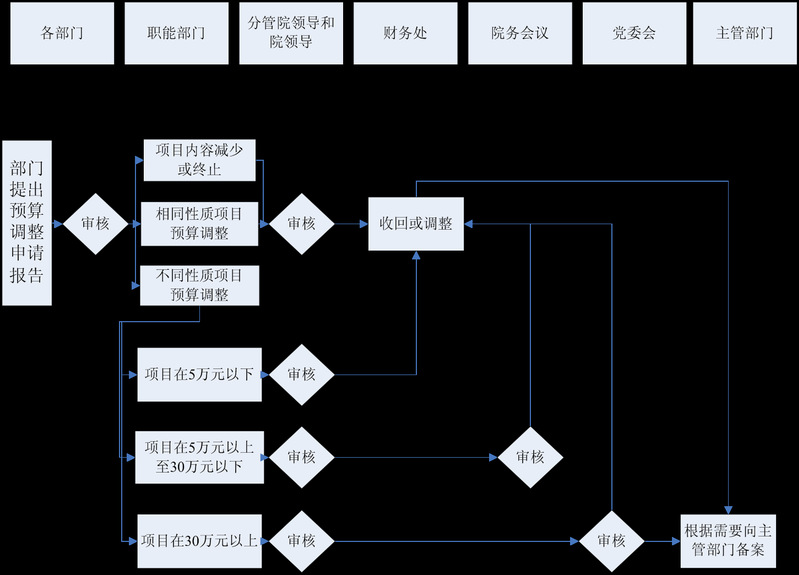 職能部門(mén)審核意見(jiàn) → 分管院領(lǐng)導(dǎo)審批 → 院領(lǐng)導(dǎo)審批 → 黨委會(huì)議審議 → 財(cái)務(wù)處根據(jù)指示調(diào)整 → 根據(jù)需要向上級(jí)主管部門(mén)備案。