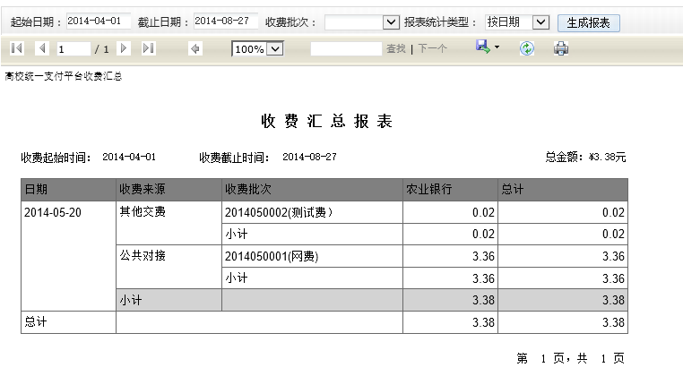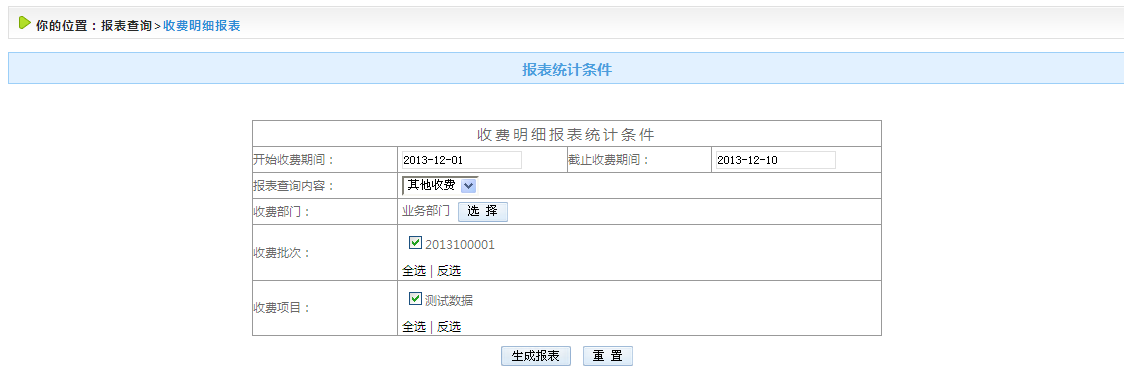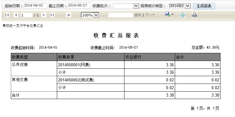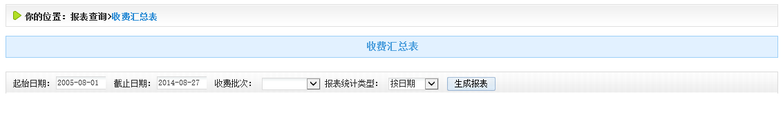 選擇需要生成報表的時間段、收費批次以及需要生成的統(tǒng)計類型,點擊生成報表按鈕。如圖4.4.3-2、4.4-3所示: