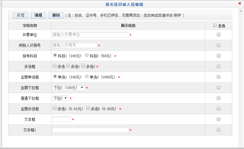 (1)此位置可以自定義報名選項,可約束學(xué)生在報名時是否是必填或選填;