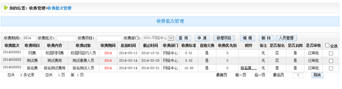 收費管理主要包括收費項目管理,收費批次管理。
