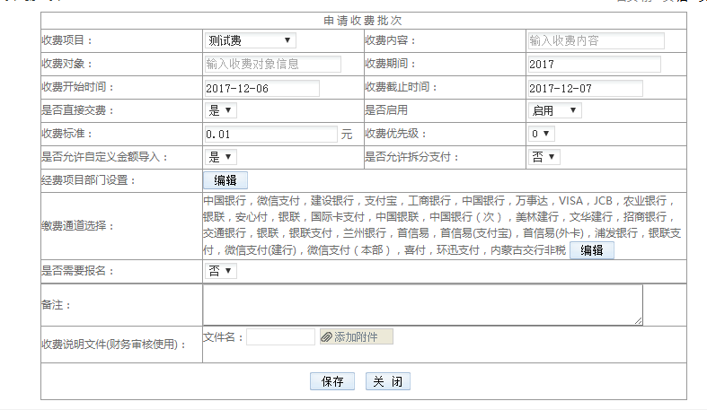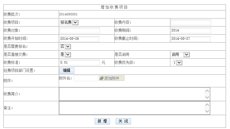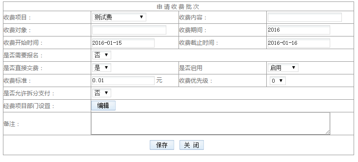 3)收費開始、截止時間:定義收費起止時間,學(xué)生只能在該期間內(nèi)繳費。