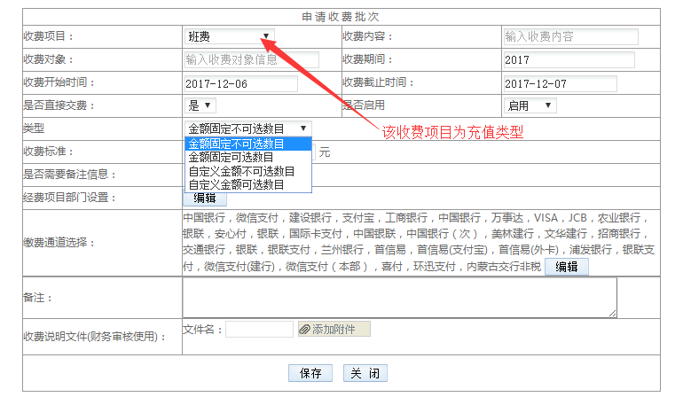 5)收費類型:充值——對應(yīng)前臺項目為生活繳費,使用場景:可以允許學(xué)生重復(fù)繳費的項目,比如一卡通補卡費、停車費。