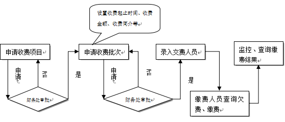 收費部門收費流程:申請收費項目——>等待財務(wù)處審批——>使用已審批項目申請收費批次(制定具體交費時間、交費標準等)——>等待財務(wù)處審批——>向已審批的收費批次中導(dǎo)入收費人員信息——>監(jiān)控收費狀況——>查詢交費結(jié)果——>交費結(jié)束。如下圖: