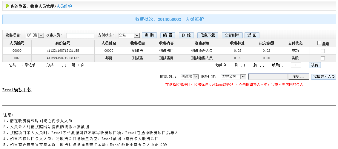 1)人員編號、人員姓名必須填寫,建議錄入身份證號,以供繳費人員確認信息。