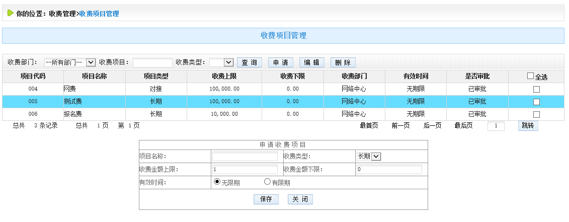 收費項目管理包括:收費項目申請、查詢、編輯和刪除等功能。如圖4.2.1-1所示: