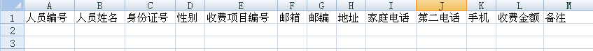 Excel模板包括人員編號、人員姓名、身份證號、性別、收費項目編號、郵箱、郵編、地址、家庭電話、第二電話、手機、交易金額、備注13條信息如圖4.3-7所示: