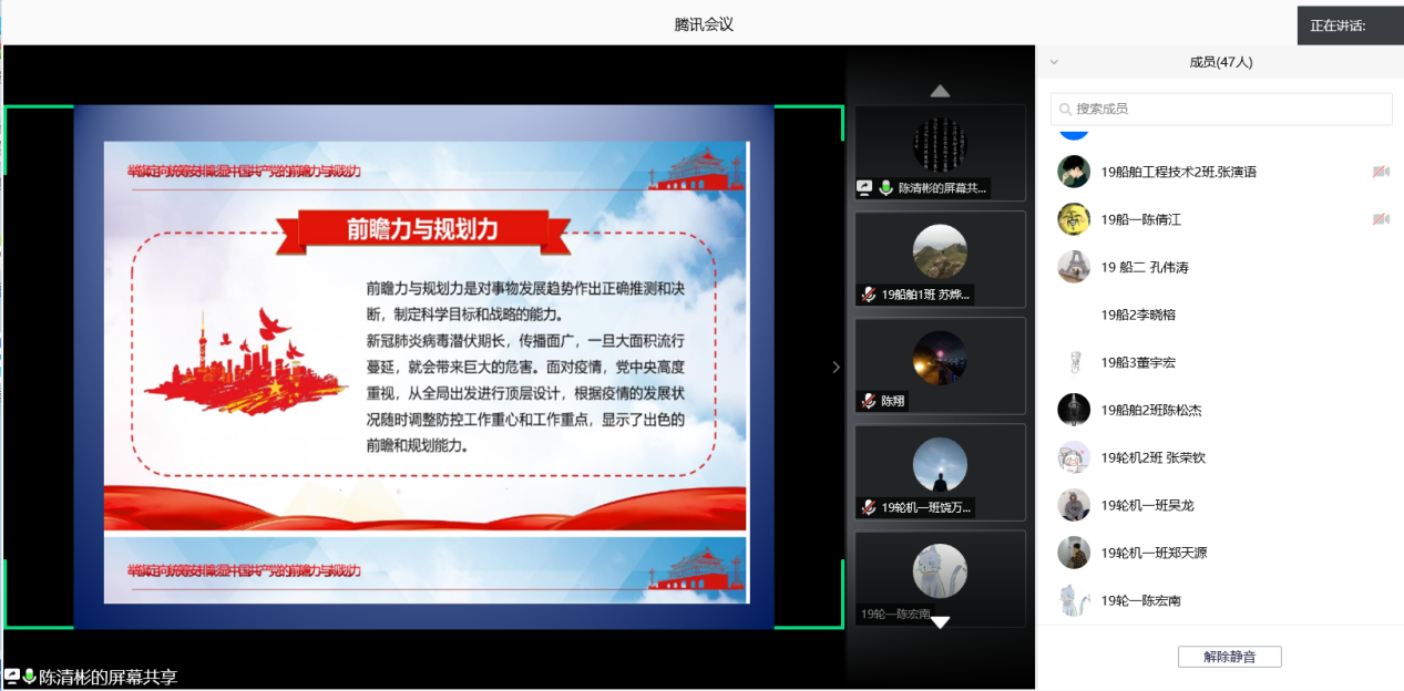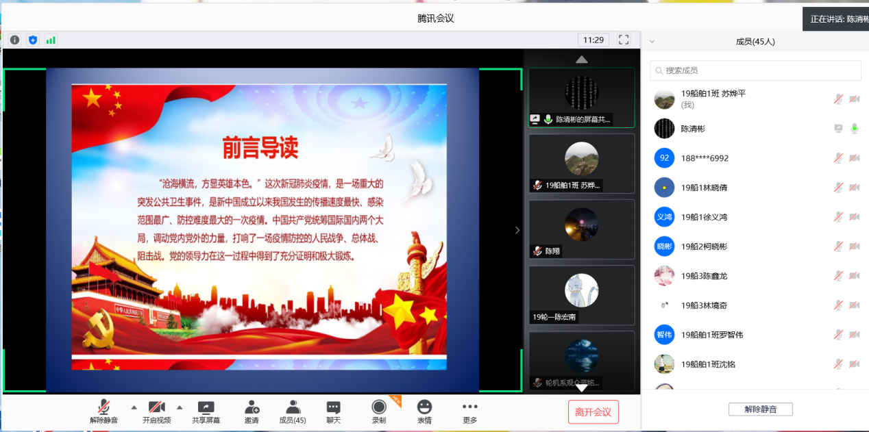 “滄海橫流,方顯英雄本色?!边@次新冠肺炎疫情,是一場重大的突發(fā)公共衛(wèi)生事件,是新中國成立以來我國發(fā)生的傳播速度最快、感染范圍最廣、防控難度最大的一次疫情,中國共產(chǎn)黨統(tǒng)籌國內(nèi)國際兩個大局,調(diào)動黨內(nèi)黨外的力量,打響了一場疫情防控的人民戰(zhàn)爭、總體戰(zhàn)、阻擊戰(zhàn)。為了響應(yīng)國家號召,2020年6月24日下午3點(diǎn)輪機(jī)工程系在騰訊會議上為19級入黨積極分子和班干部上了一堂形勢與政策課,由系主任陳清彬講授。