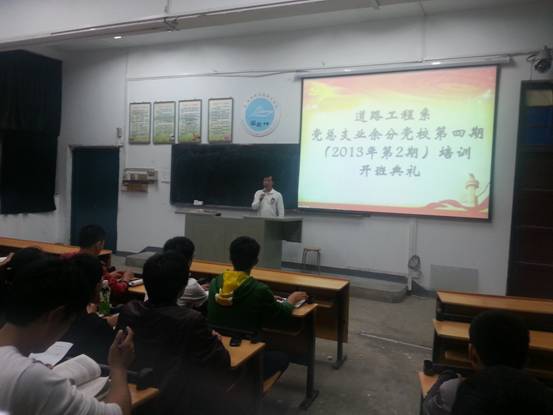 2013年10月28日晚上7:00,道路工程系黨總支業(yè)余分黨校第四期在土建樓二樓舉行入黨積極分子培訓班開班典禮。道路工程系王心金書記,曾新平輔導員, 11級第一批、第二批、第三批入黨積極分子共計16名學生參加了本次開班典禮。