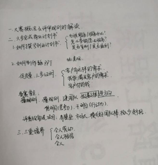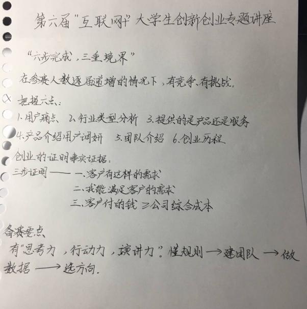 講座中,曹老師還圍繞用戶痛點(diǎn)、行業(yè)類型分析、提供產(chǎn)品or服務(wù)、介紹與用戶調(diào)研、團(tuán)隊(duì)介紹、創(chuàng)業(yè)歷程等方面,詳細(xì)講解了項(xiàng)目團(tuán)隊(duì)組建、項(xiàng)目挖掘和遴選、項(xiàng)目培育等要領(lǐng),點(diǎn)明同學(xué)們需要具備“思考力,行動(dòng)力,演講力”,活用事實(shí)證據(jù)進(jìn)行三步證明,令同學(xué)們對本次比賽情況和所需條件有了更加系統(tǒng)的了解。講座內(nèi)容層次漸進(jìn),通俗易懂,令人印象深刻,同學(xué)們對精彩的內(nèi)容進(jìn)行摘錄、備注。