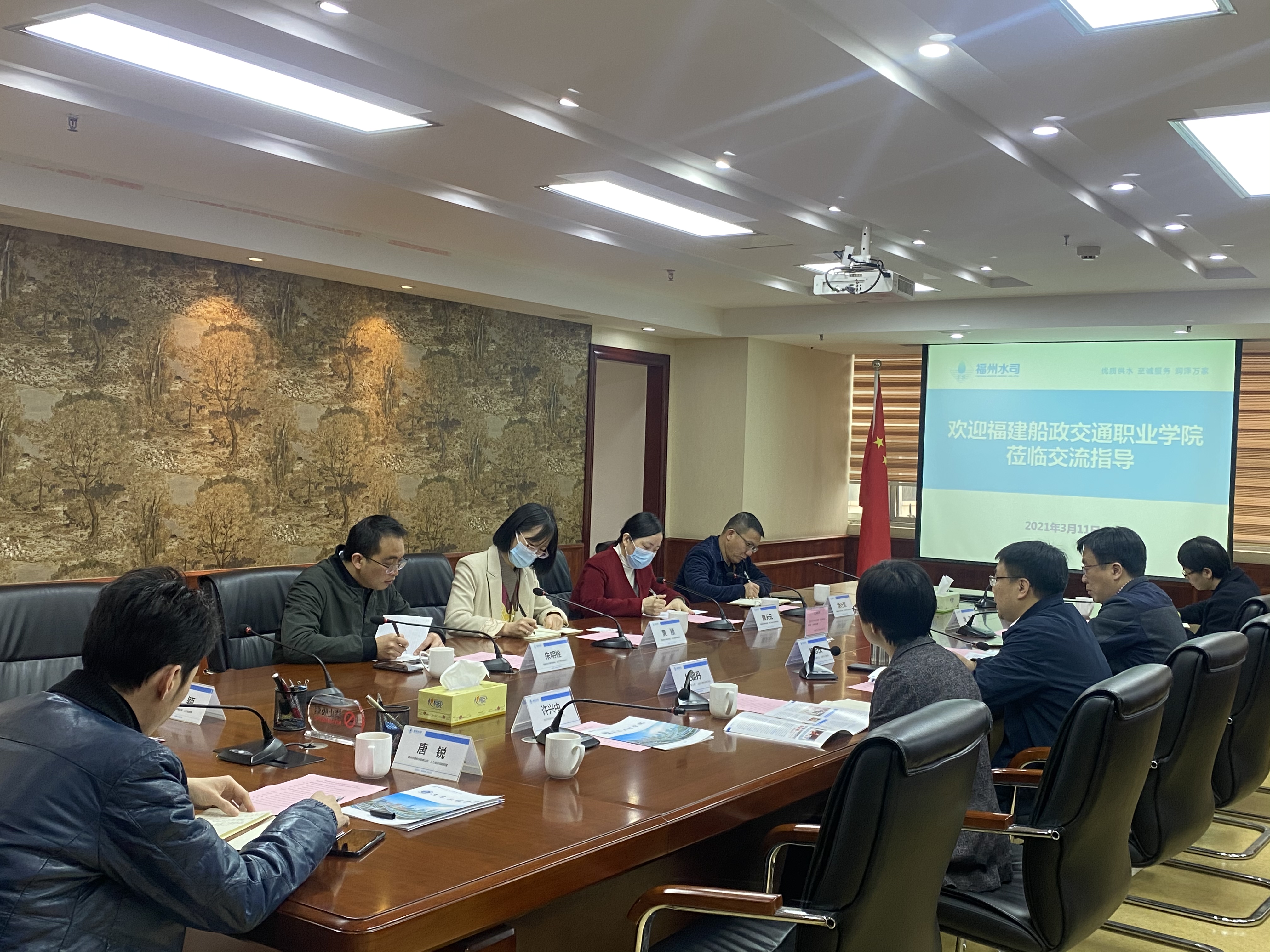 2021年3月11日,土木工程學(xué)院副院長(zhǎng)黃穎(主持工作)、副院長(zhǎng)朱明栓、實(shí)訓(xùn)中心主任徐行軍、市政教研室主任魏天云到福州市自來(lái)水有限公司進(jìn)行交流座談。福州市水務(wù)投資發(fā)展有限公司黨委委員、總工程師、福州市自來(lái)水有限公司董事長(zhǎng)魏忠慶,總經(jīng)理杜朝丹,副總經(jīng)理陳志宏,總工徐興中等參加交流會(huì)。
