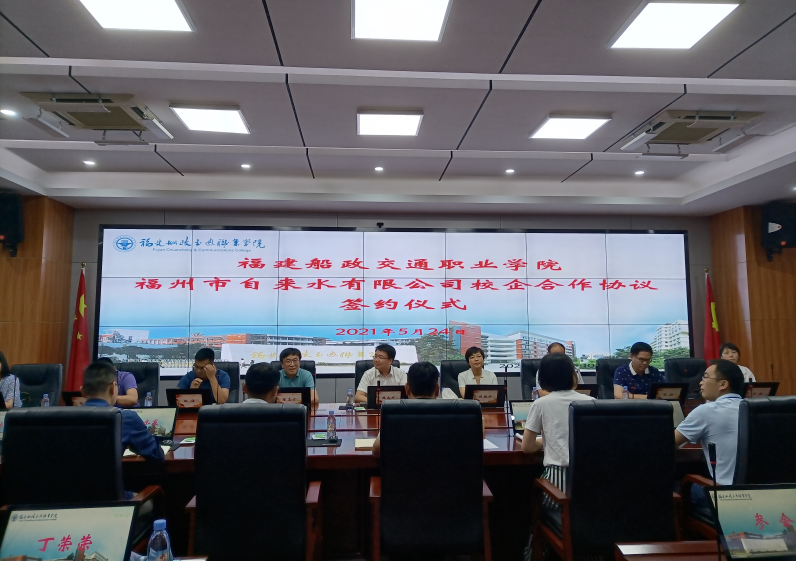 5月24日下午,福建船政交通職業(yè)學院與福州市自來水有限公司在1號樓6樓會議室成功舉行校企合作簽約儀式。福州市自來水有限公司董事長魏忠慶、總經(jīng)理杜朝丹、副總經(jīng)理陳志宏、總工程師許興中,福建船政交通職業(yè)學院副院長高汝武、土木工程學院副院長(主持工作)黃穎、副院長朱明栓、副書記任穎卿,機械與智能制造學院副院長王水發(fā)、副院長陳貴清等出席本次儀式。簽約儀式由市政工程技術(shù)教研室主任魏天云主持。