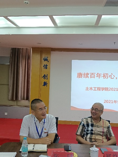 高杰書記總結(jié)發(fā)言,一是教師要學(xué)習(xí)領(lǐng)會習(xí)近平總書記“七一”重要講話精神,銘記中國共產(chǎn)黨百年奮斗歷程,傳承紅色基因,賡續(xù)建黨初心,弘揚偉大建黨精神,傳承土木工程學(xué)院 “誠信、創(chuàng)新、奉獻、和諧”的院訓(xùn),切實擔(dān)當(dāng)為黨育人、為國育才的光榮使命。二是新老師要盡快適應(yīng)新環(huán)境,加強自身學(xué)習(xí),提高能力,要充分發(fā)揮青年教師在學(xué)院建設(shè)和發(fā)展中的作用。